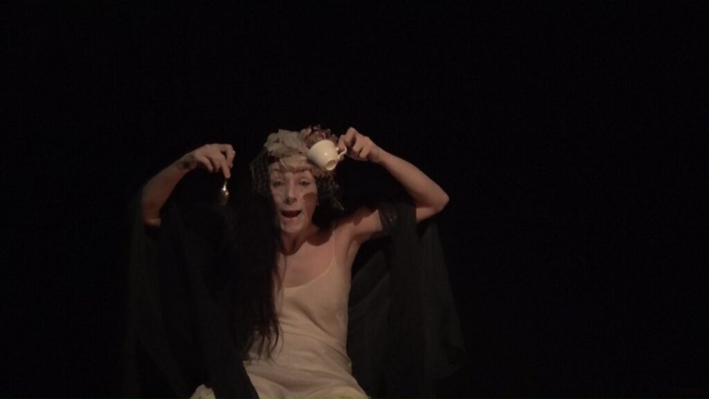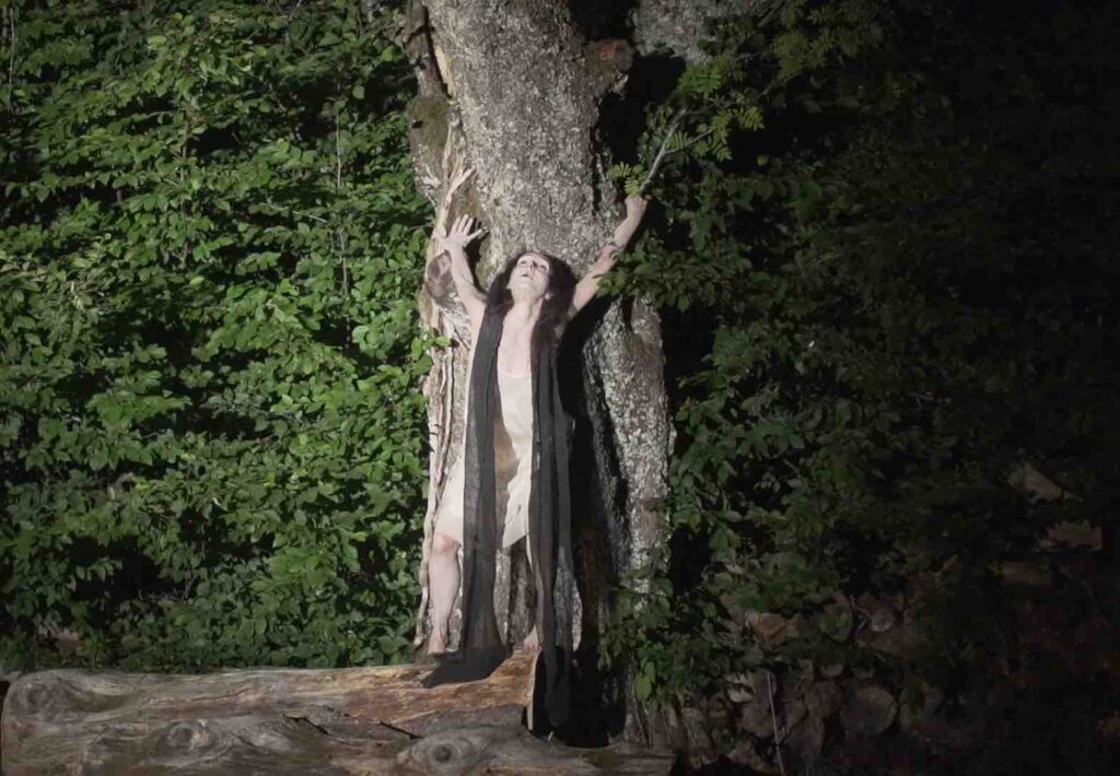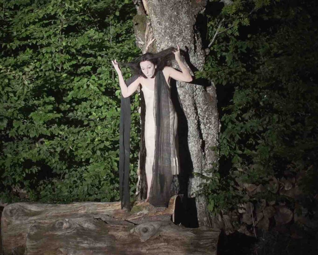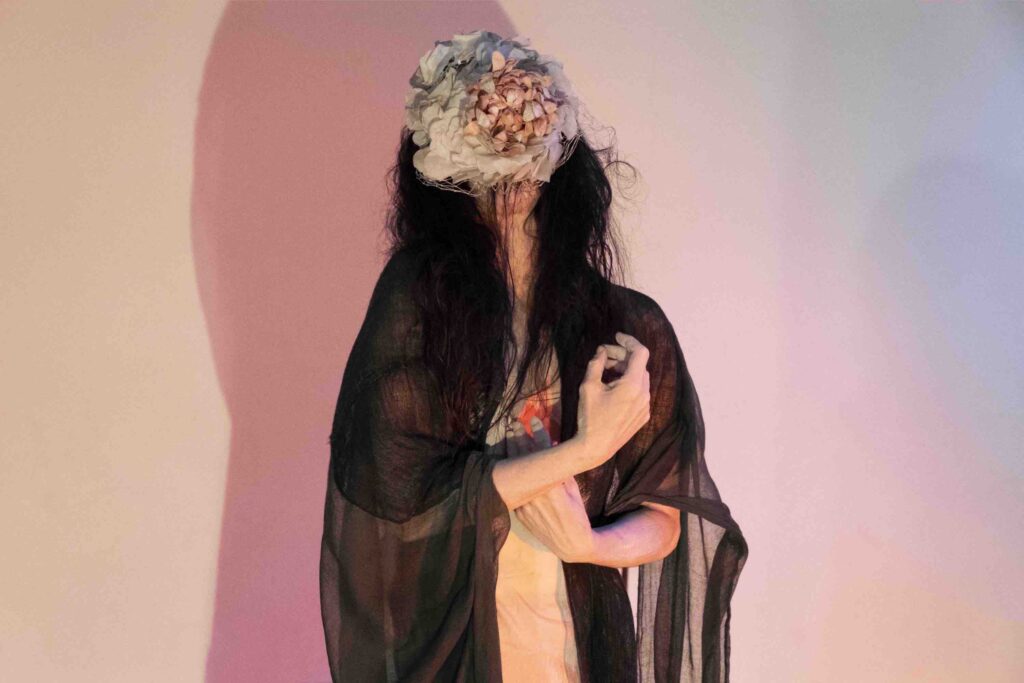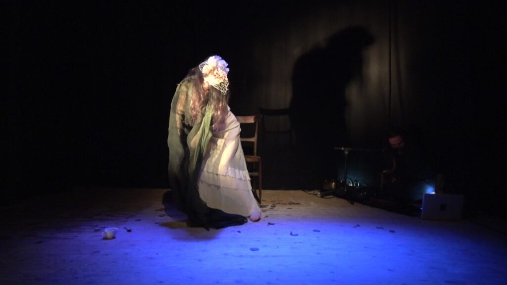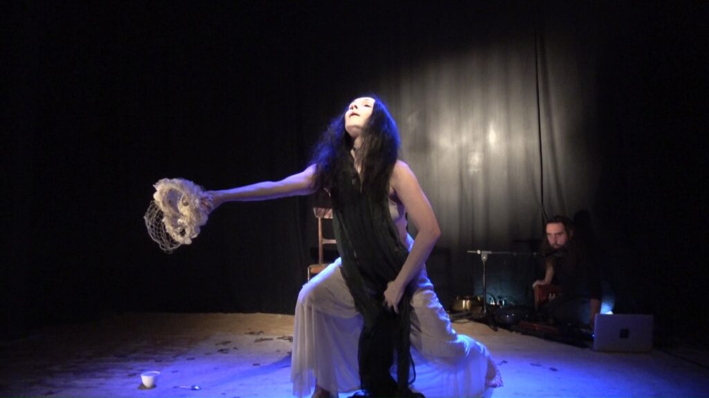 Una musica fatta di vuoti e stratificazioni sonore, che trascinano la performance nel tempo del sogno, fluttuando in un altro spazio-tempo dove gli Spiriti e gli archetipi possono manifestarsi: tra cui una donna gatto nella luce della luna, l’Amabie, una creatura magica che ha il potere di allontanare le epidemie, una vecchia mangiata dalle formiche, un fiore universale, l’antica saggezza della Terra e della vita, eterna e sempre in mutazione.
