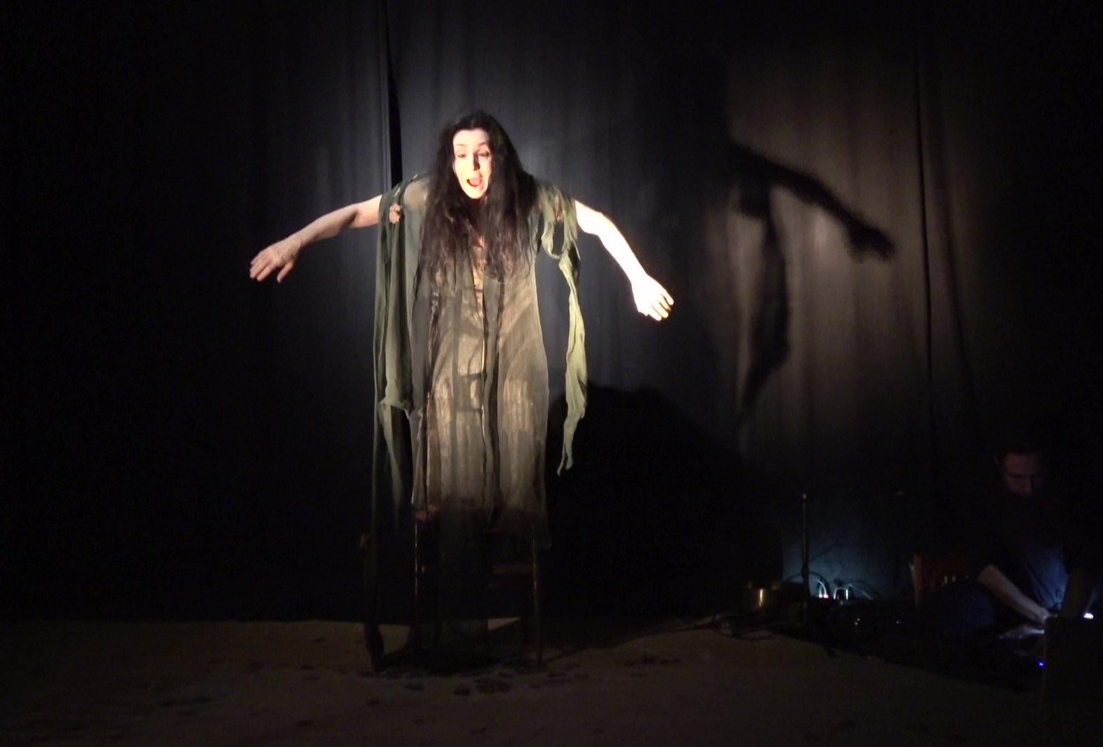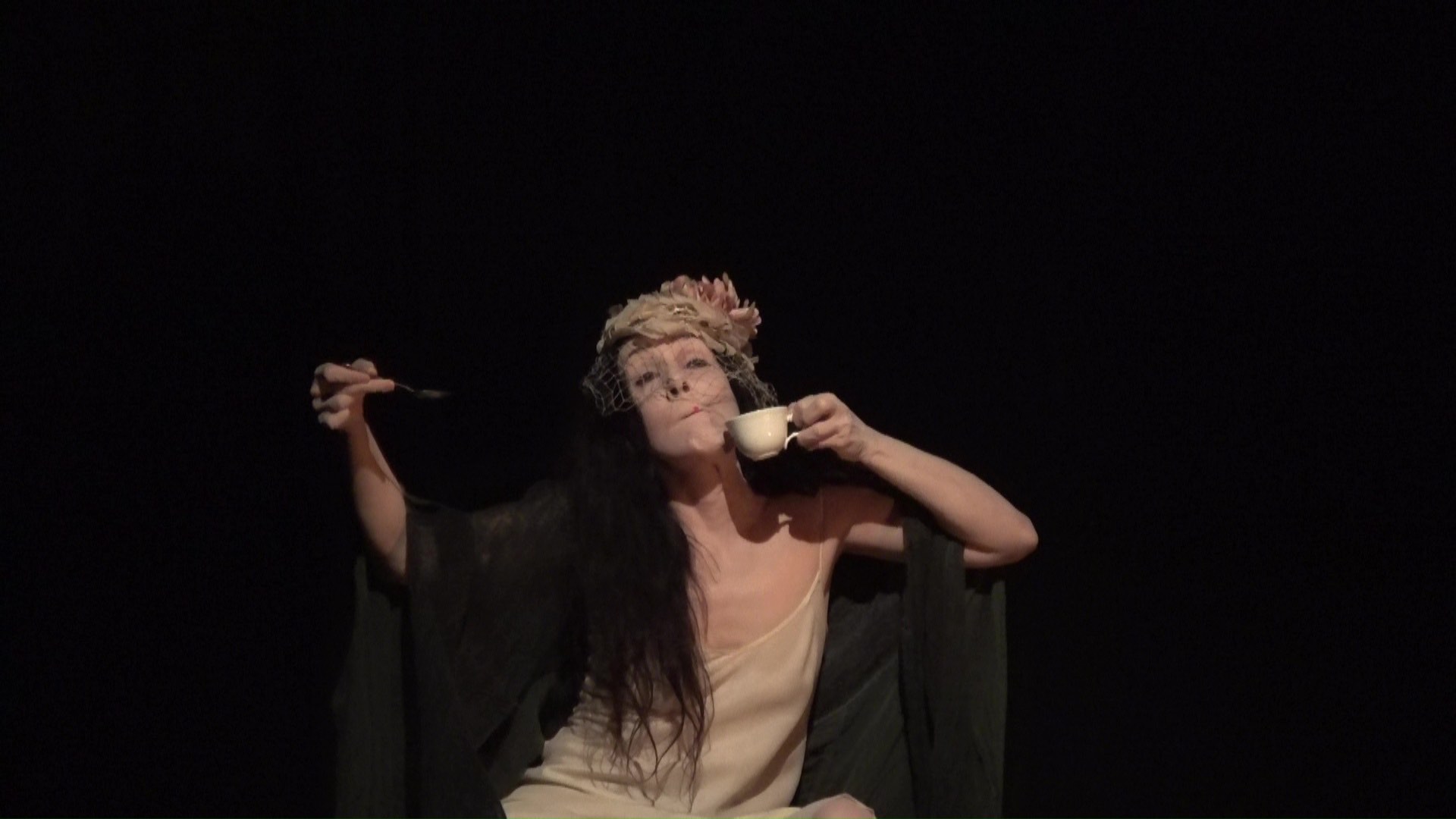 Una musica fatta di vuoti e stratificazioni sonore, che trascinano la performance nel tempo del sogno, fluttuando in un altro spazio-tempo dove gli Spiriti e gli archetipi possono manifestarsi: tra cui una donna gatto nella luce della luna, l’Amabie, una creatura magica che ha il potere di allontanare le epidemie, una vecchia mangiata dalle formiche, un fiore universale, l’antica saggezza della Terra e della vita, eterna e sempre in mutazione.