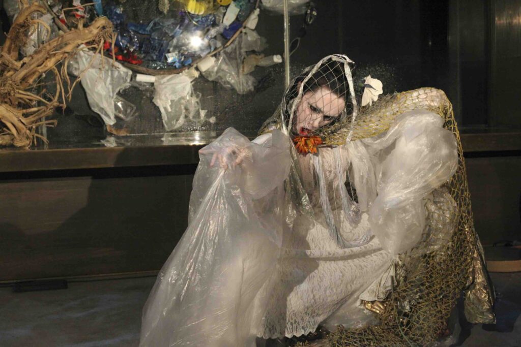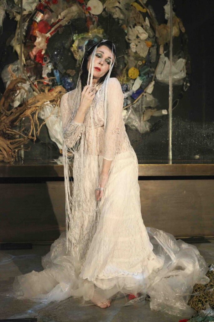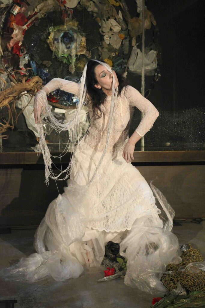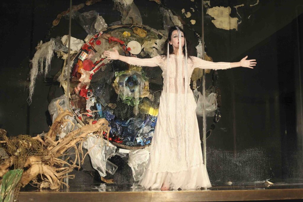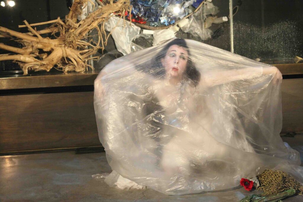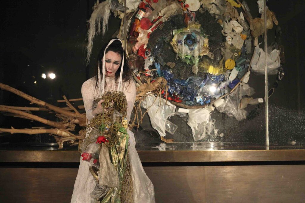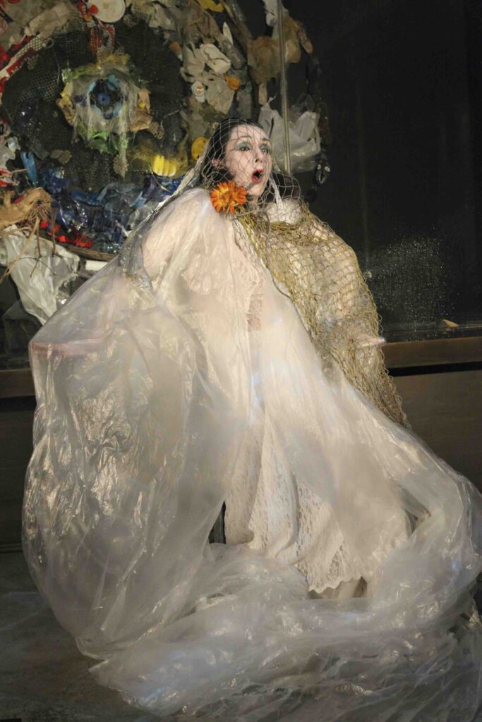 Mothersea è la madre di tutte le acque, portatrice di vita e di morte, dal volto benevolo e terrifico allo stesso tempo. Alterata dalla mano dell’uomo, avvolta e inglobata dalla plastica, assume il volto delle sirene informi, dei mostri marini, della medusa mitologica, della sofferenza di tante vite innocenti che muoiono; simbolo degli umani attaccamenti, paure e sofferenze. Metafora della caduta lontano dagli dei, dove l’uomo è sempre più separato dalla magnificenza della Natura, la quale comunque alla fine vince sempre, perché è eterna. E l’uomo? Forse si può salvare solo tornando a pregare, offrire canti, riti e rispettando la Granmammare.