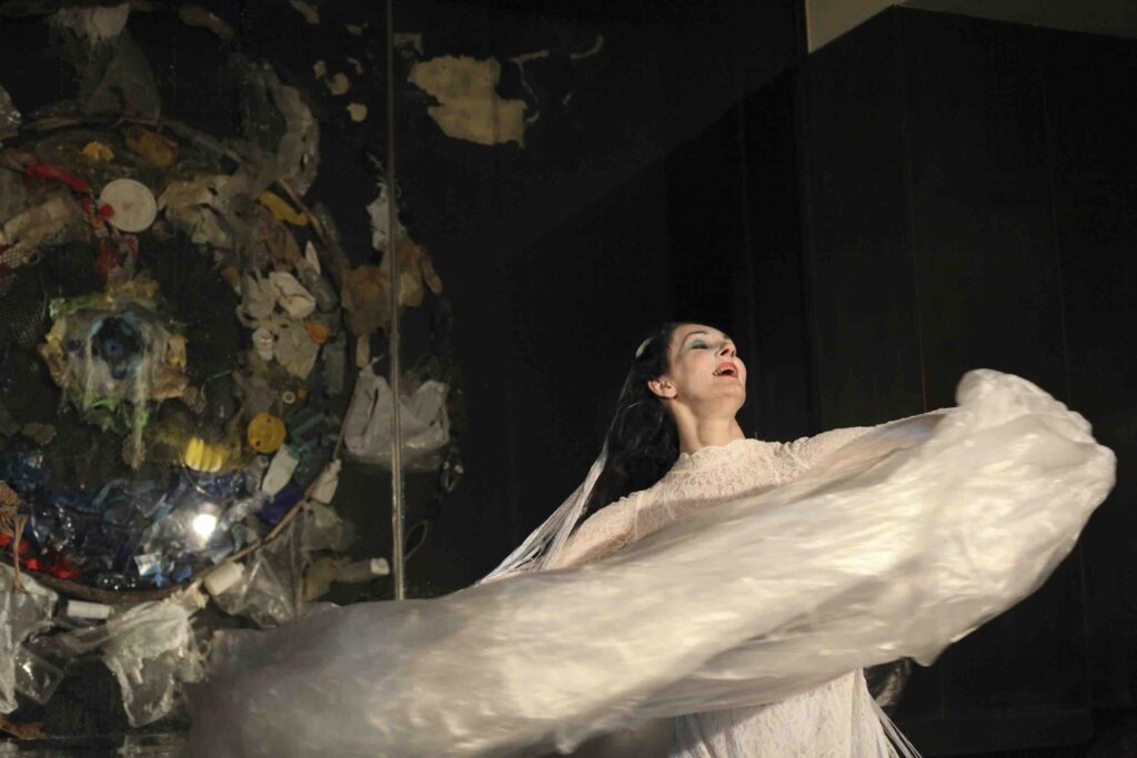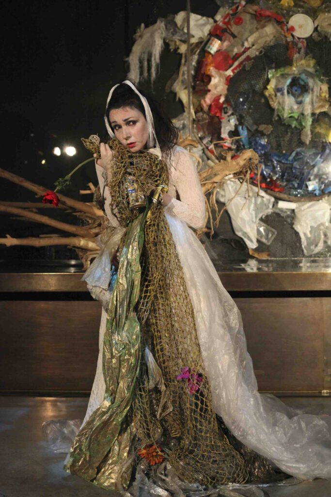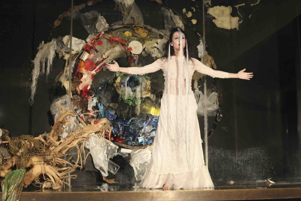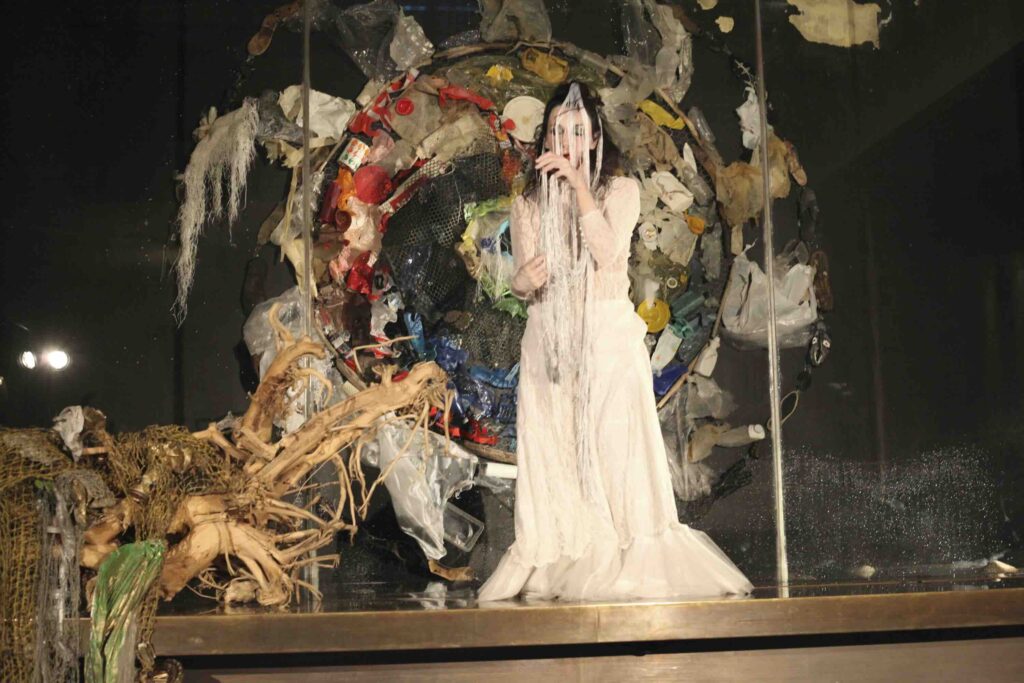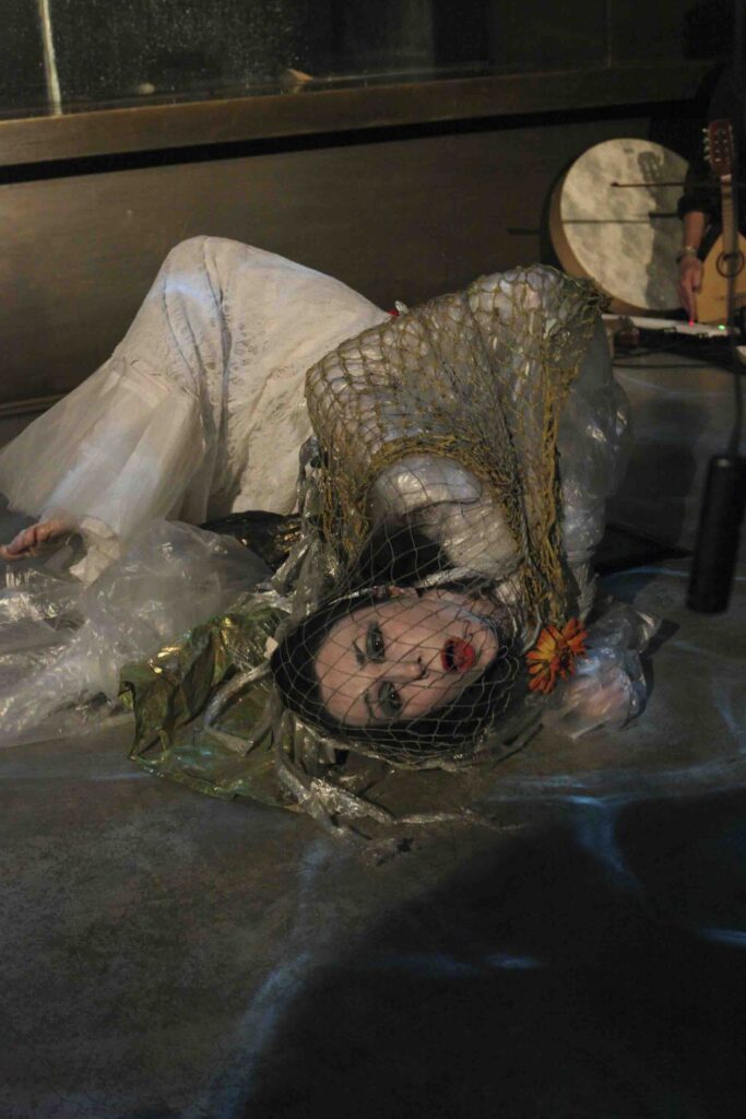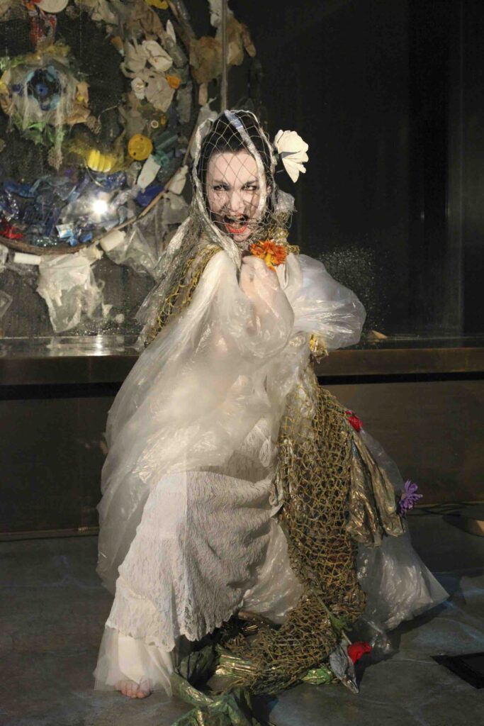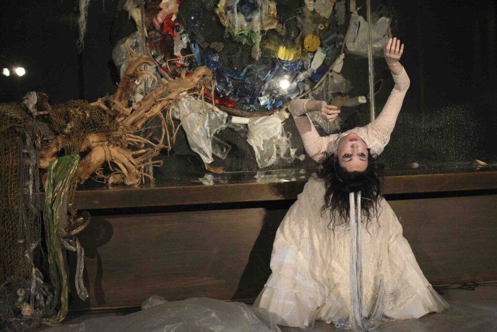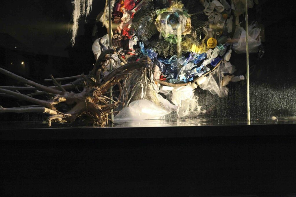 Mothersea è la madre di tutte le acque, portatrice di vita e di morte, dal volto benevolo e terrifico allo stesso tempo. Alterata dalla mano dell’uomo, avvolta e inglobata dalla plastica, assume il volto delle sirene informi, dei mostri marini, della medusa mitologica, della sofferenza di tante vite innocenti che muoiono; simbolo degli umani attaccamenti, paure e sofferenze. Metafora della caduta lontano dagli dei, dove l’uomo è sempre più separato dalla magnificenza della Natura, la quale comunque alla fine vince sempre, perché è eterna. E l’uomo? Forse si può salvare solo tornando a pregare, offrire canti, riti e rispettando la Granmammare.