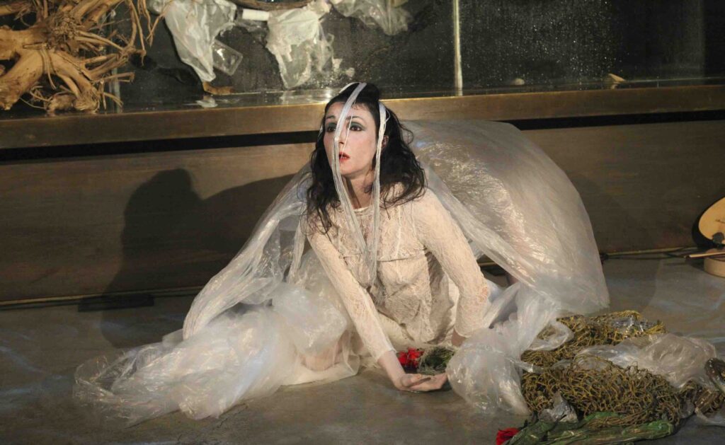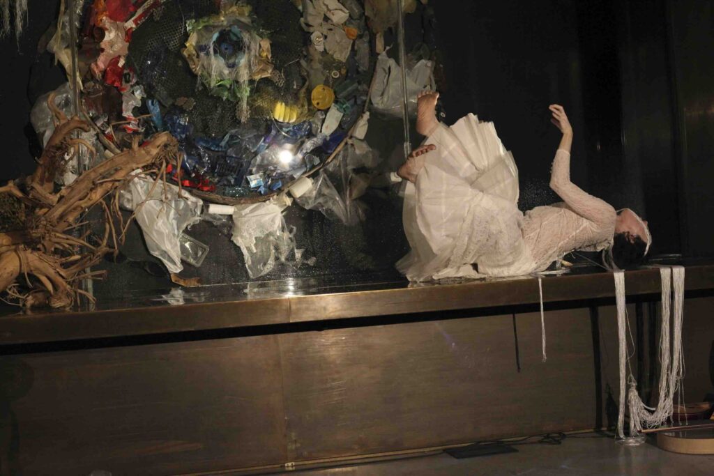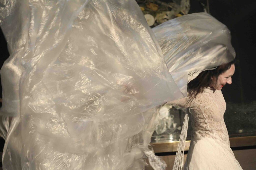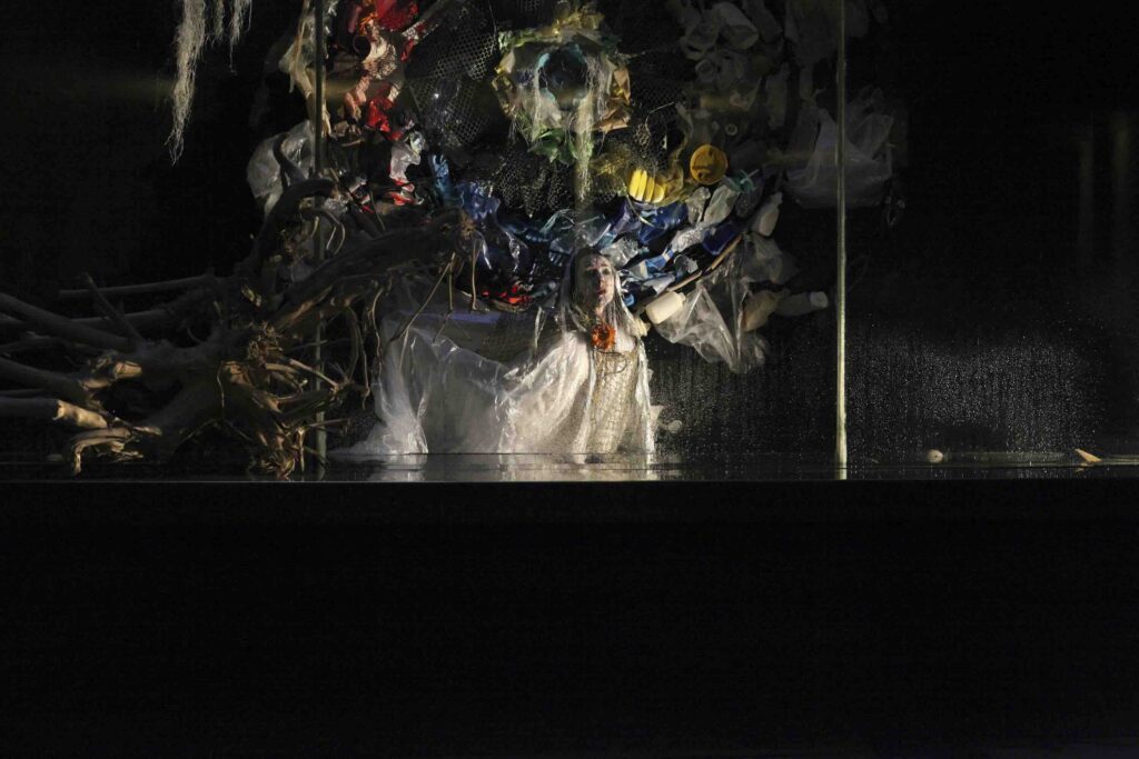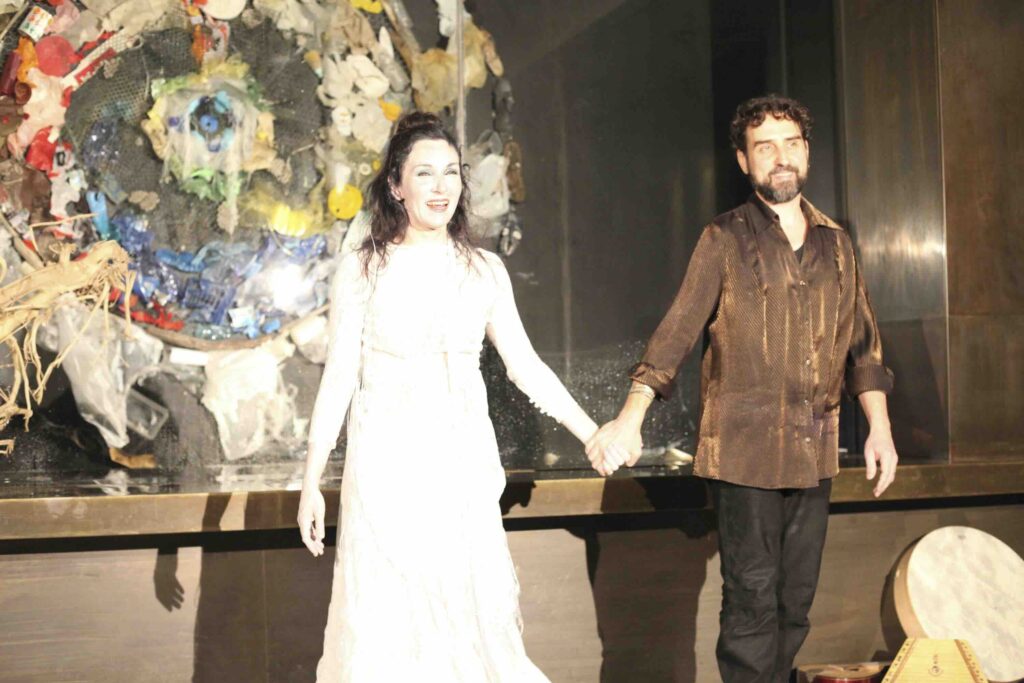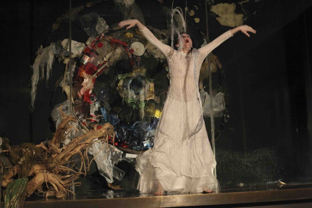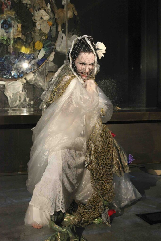 Mothersea è la madre di tutte le acque, portatrice di vita e di morte, dal volto benevolo e terrifico allo stesso tempo. Alterata dalla mano dell’uomo, avvolta e inglobata dalla plastica, assume il volto delle sirene informi, dei mostri marini, della medusa mitologica, della sofferenza di tante vite innocenti che muoiono; simbolo degli umani attaccamenti, paure e sofferenze. Metafora della caduta lontano dagli dei, dove l’uomo è sempre più separato dalla magnificenza della Natura, la quale comunque alla fine vince sempre, perché è eterna. E l’uomo? Forse si può salvare solo tornando a pregare, offrire canti, riti e rispettando la Granmammare.