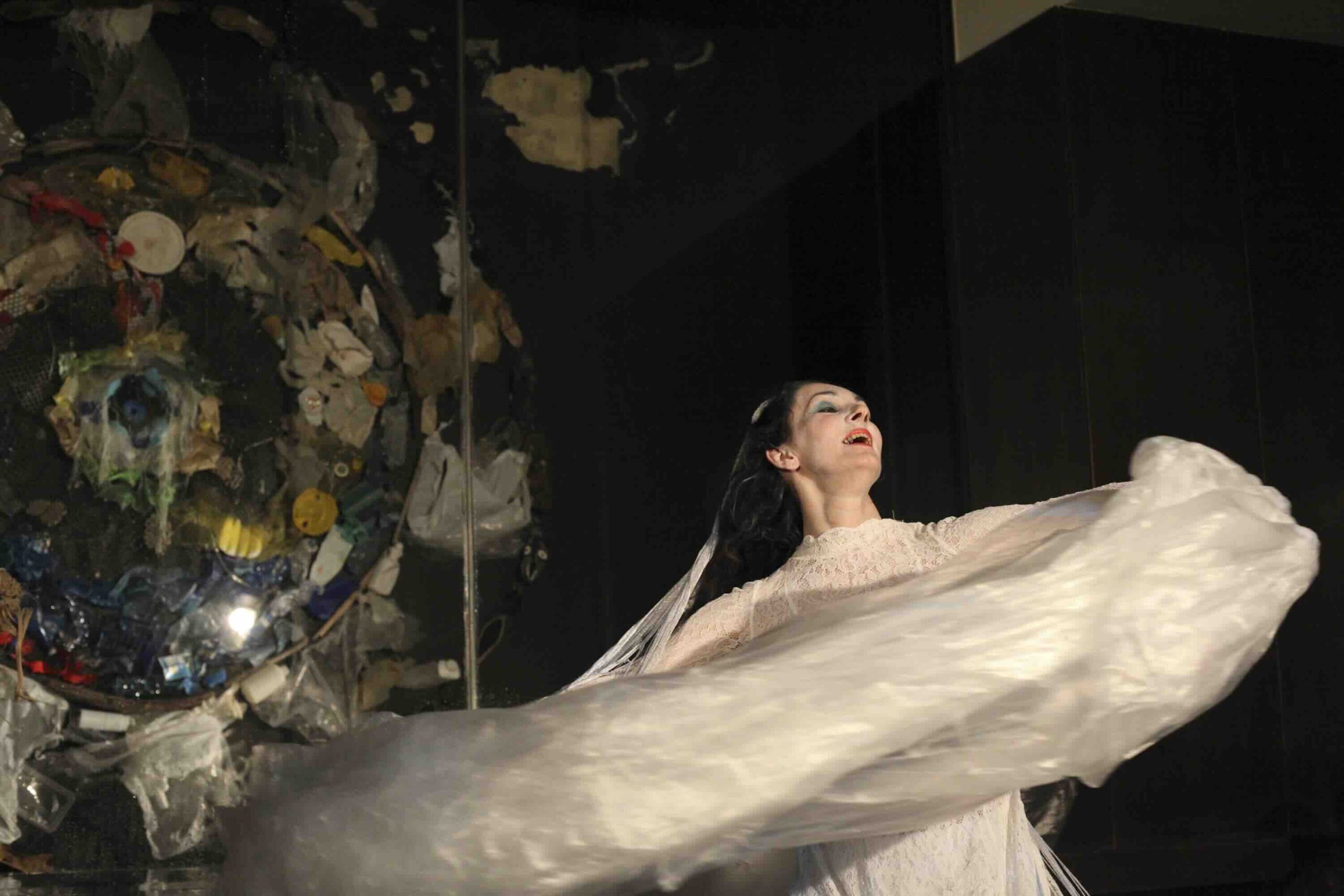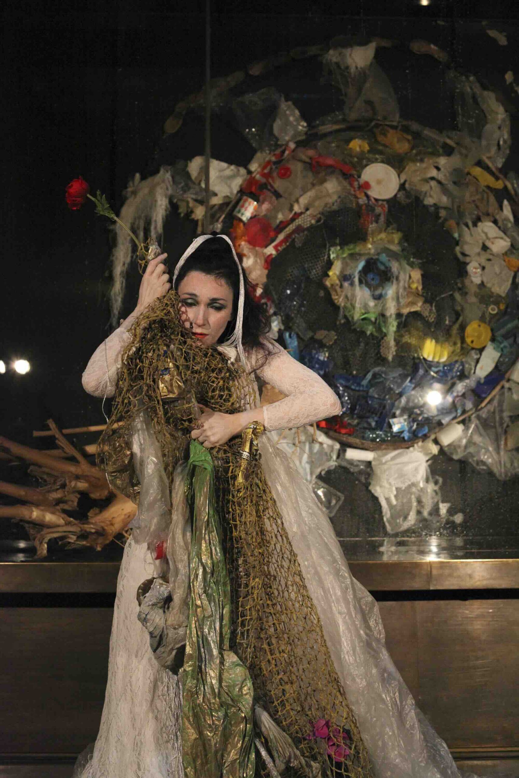 Mothersea è la madre di tutte le acque, portatrice di vita e di morte, dal volto benevolo e terrifico allo stesso tempo. Alterata dalla mano dell’uomo, avvolta e inglobata dalla plastica, assume il volto delle sirene informi, dei mostri marini, della medusa mitologica, della sofferenza di tante vite innocenti che muoiono; simbolo degli umani attaccamenti, paure e sofferenze. Metafora della caduta lontano dagli dei, dove l’uomo è sempre più separato dalla magnificenza della Natura, la quale comunque alla fine vince sempre, perché è eterna. E l’uomo? Forse si può salvare solo tornando a pregare, offrire canti, riti e rispettando la Granmammare.